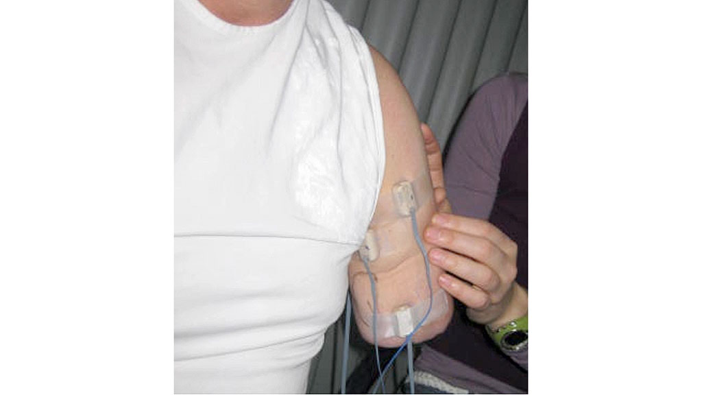 Im Oktober 2012 wurden alle Positionen der Elektroden erneut kontrolliert und optimiert. In der Schaftanprobe hat sich gezeigt, dass der Stumpf keinen Endkontakt im Schaft besitzt. Da die Elektroden für Pro- und Supination sehr weit distal liegen, ist ein Endkontakt nicht nur gewünscht, sondern zwingend notwendig. Somit sind die Probeschäfte Nummer 7 und 8 hergestellt geworden. In dieser Phase werden alle sechs Signale freigeschaltet und beübt. Dafür ist ein separater TMR-Ellenbogen mit Testschaft und separaten Elektroden notwendig, damit der Patient auf seine derzeitige TMR-Oberarmprothese nicht verzichten muss. Wir haben festgestellt, dass der Gebrauch des „normalen“ Dynamikarms die Lernkurve der TMR durch die Ansteuerung der Hand und des Ellenbogens durch Bizeps und Trizeps derart stark unterbricht, dass die Nutzung der TMR-Einheit einen zeitlichen Rückschlag erfährt. Für diesen Zeitraum wird eine komplette TMR-Einheit zur Verfügung gestellt. Ein weiter Schritt wird die Austestung eines HTV-Schaftes sein, nachdem mit dem letzten Probeschaft alle Signale ansteuerbar sind (Abb. 7a u. b).