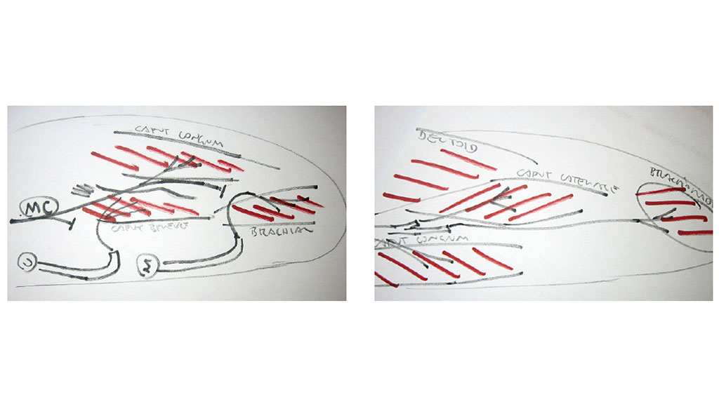 In dieser OP werden Nervenhauptstämme mit anderen Muskelnerven verbunden. In einer schematischen Darstellung werden die zu innervierenden Muskeln und Nerven zunächst aufgezeichnet, um den Operationsvorgang zu planen. In einer vierstündigen Operation wurden vier Muskelgruppen am linken Oberarmstumpf mit bisher funktionslosen Nervenstämmen neu innerviert (Abb. 2).