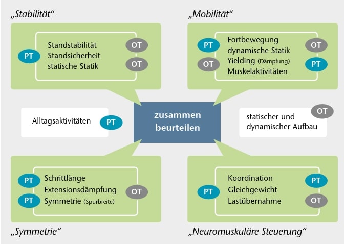 Beim Aspekt „Stabilität“ fallen die Beurteilungskriterien „Standstabilität“ und „statische Sicherheit“ eher in den Wirkungsbereich des Orthopädie-Technikers, der Aspekt „Standsicherheit“ dagegen eher in den Bereich des Physiotherapeuten.