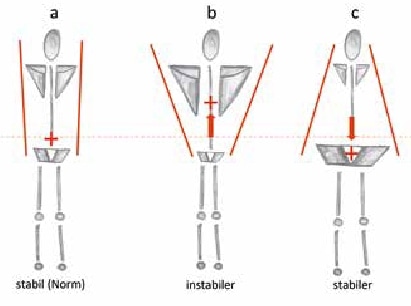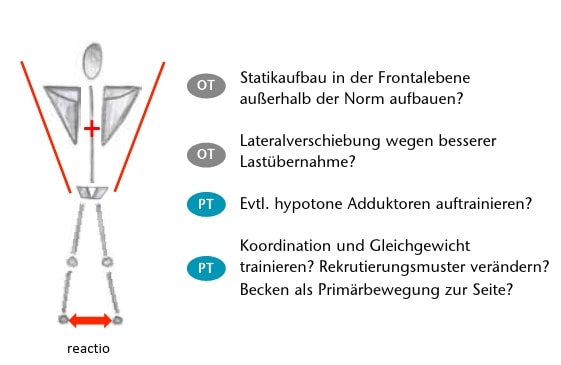 Die möglichen Konsequenzen werden nachfolgend an zwei praktischen Beispielen veranschaulicht. Das erste Beispiel beleuchtet den Zusammenhang zwischen der Konstitution und dem potenziellen Einfluss auf die Spurbreite. Wenn der Patient einen hohen Schwerpunkt aufgrund eines vergrößerten Schultergelenkabstandes und viel Körpermasse im Brustkorb- und Schulterbereich aufweist, wird er zwangsläufig im Zweibeinstand eine verbreiterte Spur einnehmen. In Abbildung 2 werden die konstitutionellen Variationen mit ihren potenziellen Auswirkungen aufgezeigt. Die logische „reactio“ aus einem zu weit nach kranial verschobenen Schwerpunkt ist in Abbildung 3 gut ersichtlich. Die möglichen Konsequenzen seitens des Orthopädie-Technikers sind einerseits, den Statikaufbau in der Frontalebene außerhalb der Norm aufzubauen, und andererseits, eine vermehrte Lateralverschiebung aufgrund der besseren Lastübernahme einzustellen. Der Physiotherapeut wird seinerseits mit folgenden Maßnahmen konfrontiert: eventuell die potenziell hypotonen Adduktoren auftrainieren oder an der Koordination und am Gleichgewicht über die Primärbewegung des Beckens arbeiten. Bei diesem Beispiel stehen vier mögliche Hypothesen als Ursache für den vorliegenden Gehfehler zur Verfügung. Nun gilt es gemeinsam zu beurteilen, welche der Hypothesen die aktuell wahrscheinlichste ist und mit welcher Maßnahme man sie zu beheben versucht.