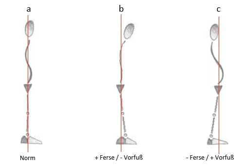 Abbildung 4c zeigt genau das Gegenteil: Durch die kurze Ferse und den langen Vorfuß will der Patient möglichst wenig Gewicht auf den Rückfuß geben. Das bedeutet für ihn Unsicherheit und potenzielle Sturzgefahr nach hinten. Der „Vorfußsteher“ belastet seinen Vorfuß vermehrt, und somit verschiebt sich die Lotlinie in den Vorfußbereich. Die Statik reagiert mit einer Überstreckung der Knie, einer vermehrten lumbalen Lordose und einer Kopfprotraktion. Dabei wird die Schrittauslösung bei einer Oberschenkelamputation bezüglich des Drehpunktes des Prothesenknies deutlich erschwert.