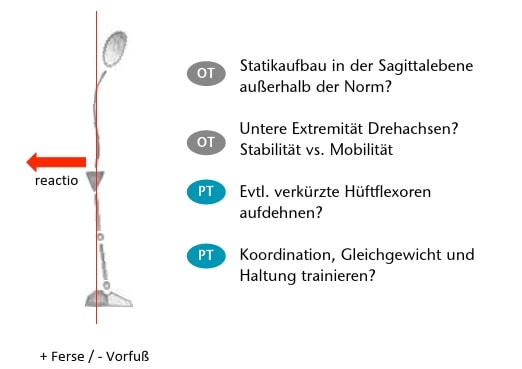 Ist die Prothese im Normaufbau, versucht der Betroffene stets, die Prothese auf der Ferse oder auf dem Vorfuß zu belasten (also sein bekanntes Muster einzunehmen). Dies gelingt ihm jedoch nur schwer; somit sollte die Prothese dementsprechend außerhalb der Norm aufgebaut werden. In Abbildung 5 werden die möglichen Konsequenzen bei einem Fersensteher jeweils aus der Sicht des Orthopädie-Technikers und des Physiotherapeuten dargestellt. Seitens der Prothese muss eine Anpassung außerhalb der Norm stattfinden, da sich der erhaltene Fuß bezüglich seiner Statik sicherlich nicht verändert hat. Nichtsdestotrotz müssen auch auf der physiotherapeutischen Seite Maßnahmen im Sinne von mehr Bewegungsfreiheit der Hüftgelenke und der „neuromuskulären Steuerung“ in Betracht gezogen werden.