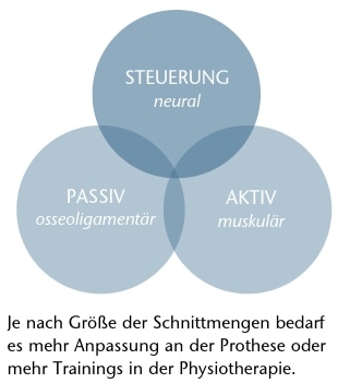 In der Gruppe „Neuromuskuläre Steuerung“ schließlich ist der Aufbau der Prothese bezüglich der „Lastübernahme“ Grundvoraussetzung für eine gute „Koordination“ und ein genügendes „Gleichgewicht“ während des Gehens.