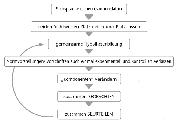Verweilen beide Berufsgruppen in ihrer eigenen Sprache und in ihrer eigenen Sichtweise, nützen auch übereinstimmende Zielsetzungen nicht viel. Ein aktives aufeinander Zugehen im Sinne einer Horizonterweiterung ist die beste Voraussetzung für einen Nutzen beim Patienten. Die beiden Berufsgruppen sollten sich in ihrer Fachsprache (Nomenklatur) eichen und gemeinsam Ziele formulieren. Erst dann ist eine gemeinsame Untersuchung und Beurteilung mit der Bildung verschiedener Hypothesen gewinnbringend. Die aktuell wahrscheinlichste Hypothese sollte gemeinsam priorisiert und dann entsprechende Interventionen oder Maßnahmen ergriffen werden. Nach erfolgter Änderung oder Therapieintervention sollte gemeinsam eine Neubeurteilung stattfinden und weitere Schritte besprochen werden. Abbildung 8 visualisiert ein mögliches Vorgehen für eine gewinnbringende Zusammenarbeit und somit in erster Linie einen potenziellen Nutzen für den Patienten, aber auch für die beteiligten Berufsgruppen in Bezug auf deren Zusammenarbeit.