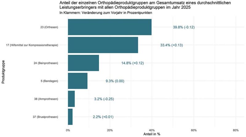 Dahinter folgen Beinprothesen mit 14,8 Prozent sowie Bandagen mit 9,3 Prozent. Kleinere Anteile entfallen auf Armprothesen (3,2 Prozent) und Brustprothesen (2,2 Prozent). Die Veränderungen zum Vorjahr fallen insgesamt sehr gering aus und bewegen sich überwiegend im niedrigen Zehntelbereich. Insgesamt zeigt sich damit eine stabile Umsatzstruktur innerhalb der Orthopädieproduktgruppen.