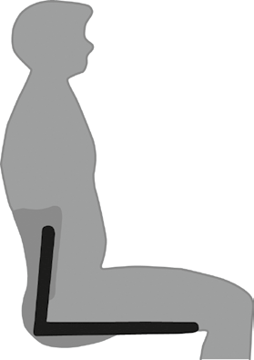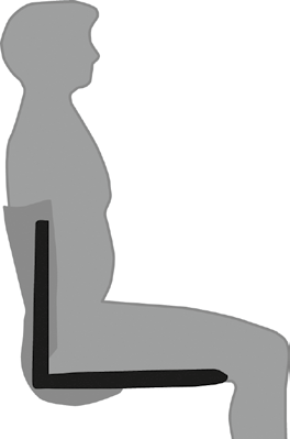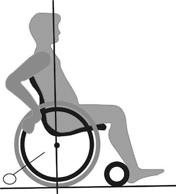 Abbildung 5 zeigt einen Paraplegiker mit einer hohen Brustwirbelläsion (ca. Th 1 bis Th 5) oder einen Tetraplegiker (sub C 7 bis C 5). Auch hier besteht kein Sitzgefälle, sodass der Rückenwinkel etwa 90° beträgt. Geht man von einem Sitzgefälle von 7° aus, wie beim Beispiel des Paraplegikers mit Rumpfmuskulatur, so wäre eine Rückenwinkeleinstellung von ca. 81 bis 85° nötig, um die Rückenlehne so aufrecht wie im Bild einstellen zu können. Bei mehr Sitzgefälle muss der Rückenwinkel automatisch kleiner werden, bei weniger Sitzgefälle größer. Eine Rollstuhleinstellung für einen Benutzer ohne Rumpfkontrolle ist in Abbildung 8 zu sehen.