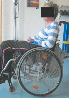 Durch eine exakt angepasste Rückenhöhe knapp unterhalb der Schulterblätter und einen genau justierten Rückenwinkel konnte die Rollstuhlfahrerin wesentlich aufrechter sitzen (Abb. 9b). Sie konnte besser atmen, und ihre Nackenmuskulatur entspannte sich, wodurch die Schmerzen im Nackenbereich nachließen. Auch rein optisch war sie mit ihrer neuen Sitzposition zufriedener. Durch die aufrechtere Stellung des Beckens fielen ihre Knie nicht mehr auseinander, und sie konnte den Gurt um die Beine komplett weglassen.