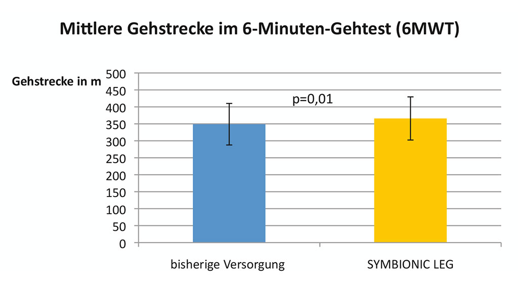 Die mitt­le­re Geh­stre­cke im 6‑Mi­nu­ten-Geh­test (6MWT) ver­län­ger­te sich von 348,9 ± 61,2 m (bis­he­ri­ge Ver­sor­gung) mit dem „Sym­bio­nic Leg“ signi­fi­kant auf 365,9 ± 63,6 m (p = 0,01) (Abb. 1).