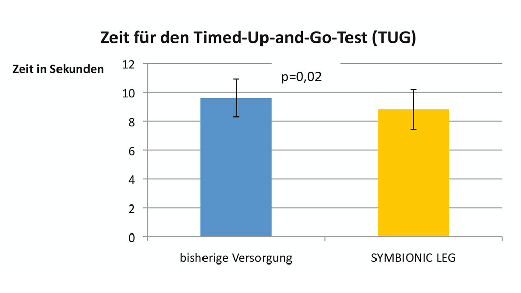 In der Gesamt­schau der Ergeb­nis­se wird deut­lich, dass das kom­plett inte­grier­te Bein­pro­the­sen­sys­tem „Sym­bio­nic Leg“ einen funk­tio­nel­len Zuge­winn an Sicher­heit und Mobi­li­tät bewirkt und damit einen wei­te­ren Fort­schritt in der Ver­sor­gung von ober­schen­kel­am­pu­tier­ten Pro­the­sen­an­wen­dern dar­stellt. Der Timed-Upand-Go-Test (TUG) ist ein vali­dier­ter und all­ge­mein aner­kann­ter Test zur Abschät­zung des Sturz­ri­si­kos 15 16 17 18 19 20 sowohl von nicht-ampu­tier­ten 21 22 23 24 25 als auch von ampu­tier­ten 26 Per­so­nen. Bei Nicht-Ampu­tier­ten zei­gen bereits Wer­te über 10 Sekun­den ein erhöh­tes Sturz­ri­si­ko an 27 28, bei unter­schen­kel­am­pu­tier­ten Per­so­nen wei­sen Wer­te über 19 Sekun­den auf ein Risi­ko für wie­der­hol­te Stür­ze hin 29. Das unter­such­te Anwen­der­kol­lek­tiv wies bereits mit der Vor­ver­sor­gung gute Wer­te von knapp unter­halb von 10 Sekun­den auf, was den hohen Mobi­li­täts- und Akti­vi­täts­grad unter­streicht. Mit dem „Sym­bio­nic Leg“ gelang es den Pati­en­ten jedoch, die für den TUG benö­tig­te Zeit noch ein­mal signi­fi­kant zu ver­rin­gern und sich damit einen noch grö­ße­ren Sicher­heits­puf­fer zum Schwel­len­wert für ein erhöh­tes Sturz­ri­si­ko zu ver­schaf­fen. Die­ses objek­ti­ve Ergeb­nis wird von den sub­jek­ti­ven Bewer­tun­gen der Pati­en­ten unter­stri­chen, die gro­ße Vor­tei­le der neu­en Pro­the­sen­ver­sor­gung z. B. bei der gerin­ge­ren Gefahr des Hän­gen­blei­bens des Fußes in der Schwung­pha­se sahen.