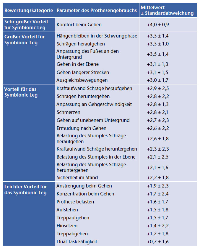 Bei der Bewer­tung der ein­zel­nen Para­me­ter des Pro­the­sen­ge­brauchs fällt zunächst auf, dass das „Sym­bio­nic Leg“ in allen Para­me­tern im Mit­tel durch­weg bes­se­re Bewer­tun­gen erhält als die Vor­ver­sor­gung. Die Ergeb­nis­se für die ein­zel­nen Para­me­ter sind in Tabel­le 1 dargestellt.