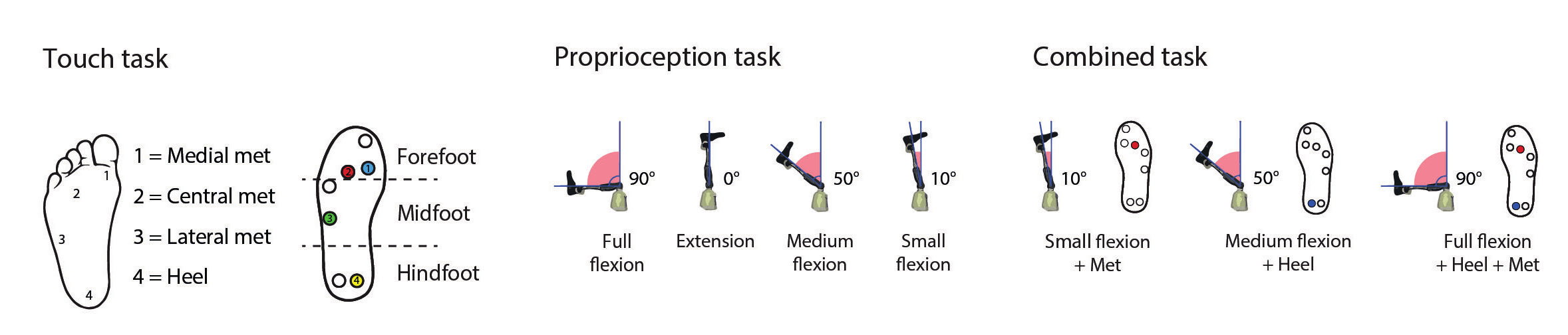 Tastsinnaufgabe: Die Probanden lagen dazu mit verbundenen Augen und akustisch abgeschottet mit dem Rücken auf einer Liege; die Prothese war ausgezogen. Für die Tastsinnaufgabe wurden die Probanden gebeten, unterschiedliche Stellen auf der Fußsohle zu bestimmen. Der Tester berührte dazu in zufälliger Abfolge verschiedene Bereiche der Sensorsohle (mediale, mittlere und laterale Metatarsalen und Ferse). Der Proband wurde gebeten, die Positionen der gefühlten Berührung auf einer Attrappe anzuzeigen. Die Probanden mussten auch erkennen, wenn keine Berührung erfolgte.