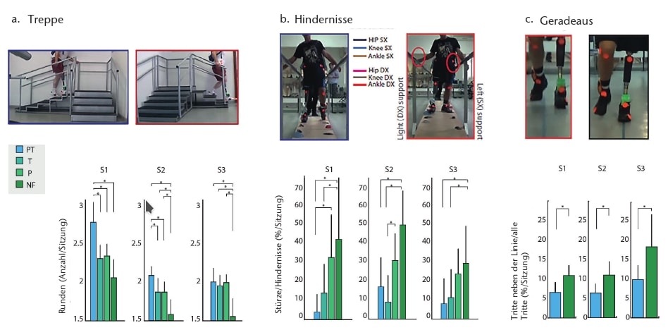 - Hindernislauf: Überwinden zufällig angeordneter Hindernisse unterschiedlicher Größe innerhalb eines Doppelbarrens ohne Zuhilfenahme der Holme. Stürze sowie die Benutzung der Holme, nachdem auf ein Hindernis getreten wurde, wurden als Fehler gewertet, Hängenbleiben an einem Hindernis in der Schwungphase und daraus resultierende Stürze jedoch nicht. Die Fehleranzahl wurde als das Verhältnis zwischen Stürzen und der Anzahl der insgesamt mit den Füßen berührten Hindernisse (mit der Prothese) berechnet.