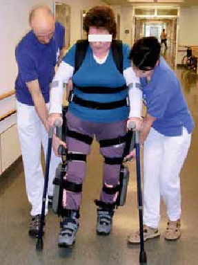Der reziproke Gang ähnelt dem physiologischen Gangbild. Gehen ist sowohl unter Zuhilfenahme eines Gehgestelles als auch von Unterarmgehstützen möglich. Das Gehgestell wird von den Patienten als sehr positiv empfunden, da es insbesondere zu Beginn mehr Sicherheit vermittelt als Unterarmgehstützen (Abb. 4).