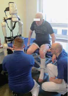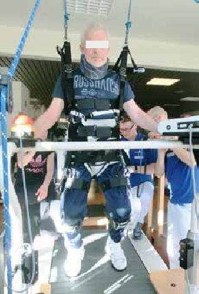 Der Rumpf ist über ein Gurtsystem an einer Rückenplatte fixiert, die fest an der Orthese angebracht ist. Durch einen breiten Bauchgurt kann eine adäquate Stabilisierung des Patienten in der Orthese erfolgen, der Schwerpunkt verbleibt zentral. Der erforderliche Akku befindet sich in einem Rucksack; durch die vorhandene Rückenplatte kommt es jedoch nicht zu einem Zug des Patienten nach dorsal, da diese den Rumpf entsprechend fixiert. Die unteren Extremitäten werden über ein System von Schellen, das in einem gewissen Abstand zur Orthese selbst angebracht ist, fixiert. Hierdurch ist eine sehr hohe Stabilität auch bei übergewichtigen Patienten gegeben (Abb. 3 u. 4). Bei keinem der Patienten ergab sich eine Schwerpunktverlagerung nach dorsal. Auch konnten keine Druckstellen ermittelt werden.