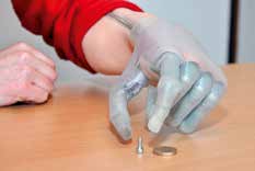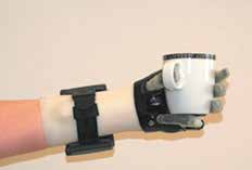 Sodann erfolgt die erste Testreihe mit verschiedenen Übungen durch den Therapeuten und den Techniker, der bei Bedarf nochmals Schaft-Veränderungen vornehmen kann. Diese Testreihe dient der Optimierung von Signalen durch Feinjustierung über die Software, z. B. das schnelle Wechseln zwischen Öffnen und Schließen und die sichere Auslösung der eingegebenen Griffprogramme. Auch das Ansteuern der Signale in verschiedenen Positionen des Armes muss getestet werden. Als hilfreicher Griff hat sich dabei der sogenannte Pinzettengriff mit einem festen teilflektierten Daumen gegenüber Dig. 2, einer kompletten Flexionsposition der Dig. 3–5 und einer Beweglichkeit des Dig. 2 in Richtung Dig. 1 erwiesen (Abb. 2). Damit sind alle wichtigen Parameter festgelegt und jederzeit abrufbar. Die Anwender üben in dieser Phase den Umgang mit alltäglichen Aktivitäten, die zuvor in einem Untersuchungsbogen festgelegt wurden, und es werden nochmals die verschiedenen Möglichkeiten der Handhabung besprochen.