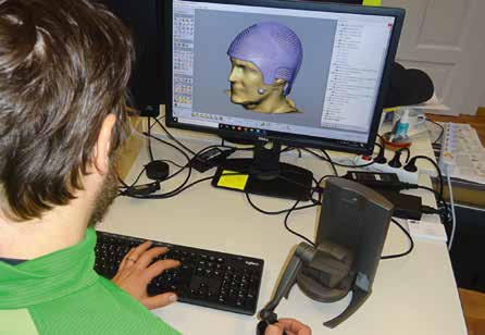 - Die zweite Möglichkeit besteht darin, anstelle des Gipsabdrucks einen berührungslosen Scan des Schädels durchzuführen, die Daten am Bildschirm zu bearbeiten und danach ein gefrästes Kopfmodell zu erstellen, über das dann wiederum thermoplastisches Material gezogen wird.