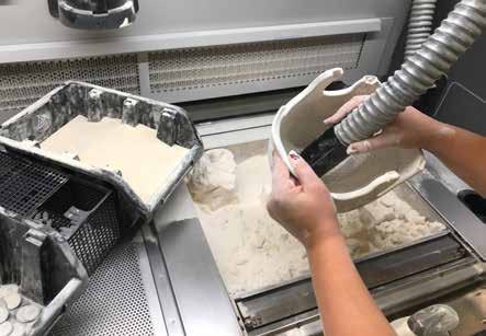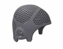 Nach Freigabe der digitalen CAD-Konstruktion durch den Auftraggeber – in diesem Fall also den Orthopädietechniker – wird der Helm im sogenannten Pulverbettverfahren mittels 3D-Drucker gedruckt. Homogene Kraftverläufe im Druckgut gepaart mit flächiger Verschmelzung sorgen dabei für stabile hochperforierte Strukturen; dies ist insbesondere unter hygienischen Aspekten wichtig (Abb. 4).