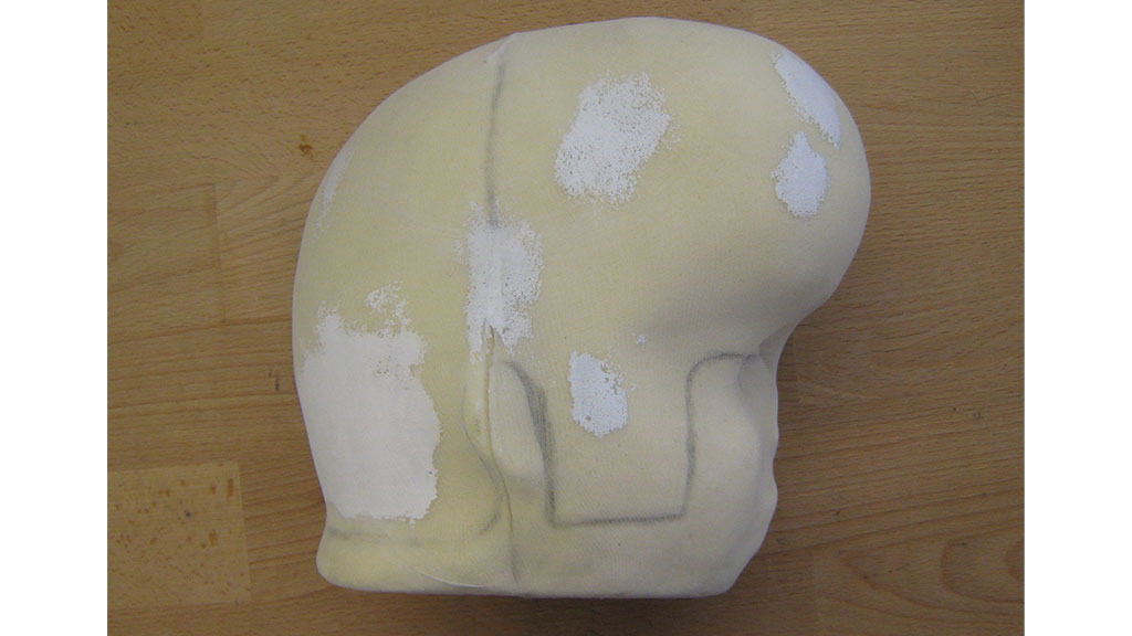 Aufgrund der Druckempfindlichkeit wurde auf einen Gipsabdruck verzichtet und stattdessen der Kopf gescannt. Die Experten erstellten auf der Grundlage der erhobenen Daten im ersten Schritt ein CNC-Modell (Abb. 3) und im zweiten Schritt einen Interimshelm aus thermoplastischem Material (Abb. 4). Dieser Interimshelm wurde einen Monat ausgiebig getestet.