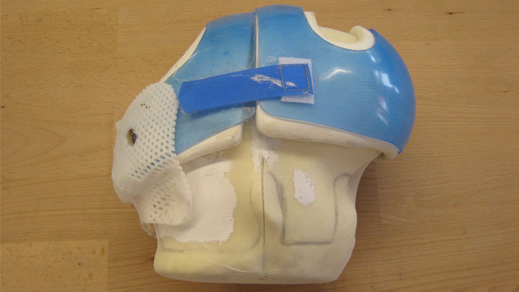 Bei früheren Versuchen, den Patienten mit einem Helm zu versorgen, traten Probleme mit dem Gewicht des Helms und der exakten Anpassung an die Form und das Volumen der Enzephalozele auf. Es darf also durch den Helm keinerlei Druck auf die Enzephalozele entstehen. Allerdings sollte auch nicht zu viel Freiraum vorhanden sein, da sonst der Helm verrutschen und wiederum Druck verursachen kann.