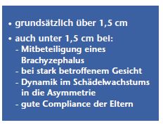 Bei Asymmetrie von über 1,5 cm, gemessen über beide Kopfdiagonalen, gilt eine Helmorthesenversorgung grundsätzlich als sinnvoll. Bei Mitbeteiligung eines Brachyzephalus oder einem stark betroffenem Gesicht ist es auch sinnvoll, unterhalb dieses Maßes eine Helmorthese zu verordnen.