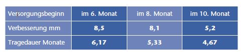 Es ist eindeutig, dass bei einem frühzeitigen Versorgungsbeginn im 6. Lebensmonat die Ergebnisse wesentlich besser sind (8,5 mm) als bei einer späteren Versorgung im 10. Monat (5,2 mm). Dies liegt am größeren Schädelwachstum in diesem Alter und an der längeren Tragezeit.