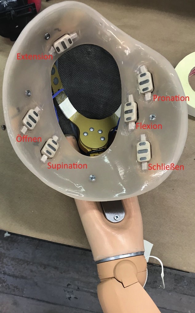 14 Monate post-OP konnte das 5. Signal, die Supination, sicher verwendet werden, und es wurde der prothetischen Versorgung eine Rotationseinheit hinzugefügt. Das 6. Signal war bald darauf als Muskelzucken auszumachen, konnte jedoch erst nach weiteren sieben Monaten konstant angesteuert werden. In dieser Zeit wurden fünf Testschäfte angefertigt, und es wurden 16 TMR-Modifikationen vorgenommen. Als definitive Schaftgestaltung wurde ein Ringschaft als Innenschaft gewählt. Der Außenschaft wurde als eine Art Kappe mit einer Distanz zum beweglichen Humerusrest auf diesem Innenschaft angebracht. So kann der Patient seinen Humerus bewegen, ohne dass es dabei zu Fehlsteuerungen durch eventuelle Hautverschiebungen kommt.