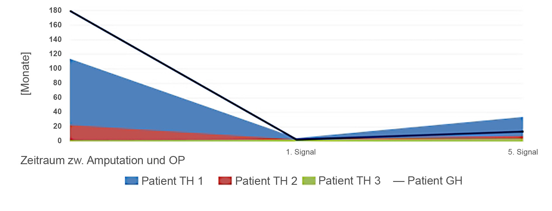 Vergleicht man im Diagramm in Abbildung 3 die Dauer der Innervationen bei den transhumeralen Patienten, ist zu erkennen, dass das Signal 5 umso schneller zu lokalisieren ist, je kürzer die Dauer zwischen Amputation und TMR-Operation ist. Zieht man einen Vergleich zwischen den transhumeral versorgten Patienten und dem oben vorgestellten glenohumeralen Patienten (Dauer zwischen OP und TMR 180 Monate; in Abb. 3 mit einer dunkelblauen Linie gekennzeichnet), ist Abbildung 3 zu entnehmen, dass bei ihm das 5. Signal schneller (um 20 Monate) lokalisierbar war als bei dem transhumeral langzeitamputierten Patienten (Patient TH 1, OP bis TMR: 114 Monate). Es lässt sich vermuten, dass dies auf die kürzere Innervationsdistanz des genutzten Nervs zum Zielmuskel zurückzuführen ist.