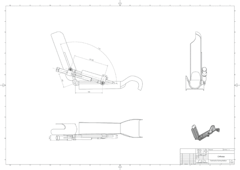 Immer wie­der wird von den Betrof­fe­nen der Wunsch des Fahr­rad­fah­rens ange­ge­ben. Da jedoch bei einer kom­ple­xen Läsi­on die vor­han­de­ne Tri­zeps- und Bizeps­funk­ti­on schwach oder nicht vor­han­den ist, wur­de über eine mecha­ni­sche Ellen­bo­gen­sta­bi­li­sie­rung zur effek­ti­ven Len­kung, aber vor allem auch zum Brem­sen des Fahr­rads nach­ge­dacht. So wur­den nach Berech­nung der Anlenk­punk­te eines spe­zi­el­len hydrau­li­schen Stoß­dämp­fers zur Funk­ti­ons­un­ter­stüt­zung des Ellen­bo­gens Adap­ter in die Koh­le­fa­ser­kon­struk­ti­on ein­ge­gos­sen, um den ein­stell­ba­ren Dämp­fer fixie­ren zu kön­nen (Abb. 9). Die­ser muss auf das Gewicht und die Akti­vi­tä­ten des Pati­en­ten aus­ge­legt sein und soll­te mög­lichst mit der nicht geschä­dig­ten Hand der Kör­per­ge­gen­sei­te manu­ell schnell jus­tier­bar sein. Liegt kei­ne Hand­funk­ti­on vor, wer­den Hand und Lang­fin­ger in einer Art Lage­rungs­scha­le fixiert und über einen spe­zi­el­len Kunst­stoff­ad­ap­ter am Len­ker des Fahr­rads adap­tiert. Die­ser kann sich im Sturz­fall lösen. Nach umfang­rei­chen Tests mit hydrau­li­schen und pneu­ma­ti­schen Dämp­fer­sys­te­men scheint der Ein­bau von Hydrau­lik­dämp­fern das Mit­tel der Wahl zu sein.