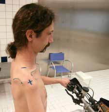 Nach dem Gips­ab­druck in Funk­ti­ons­stel­lung, bei dem alle knö­cher­nen Struk­tu­ren gut ange­zeich­net sein müs­sen, kann eine Koh­le­fa­ser­scha­le her­ge­stellt wer­den, die Brust, Schul­ter und Schul­ter­blatt umschließt und über ein Mul­tiaxi­al­ge­lenk mit einer Ober­arm­scha­le ver­bun­den ist. Bei der Anpro­be ist es mög­lich, über straf­fe oder elas­ti­sche Zug­zü­gel, die in Umlenk­schlau­fen geführt wer­den, das Bewe­gungs­aus­maß im Sin­ne der Außen-/In­nen­ro­ta­ti­on sowie der Abduk­ti­on sta­tisch oder dyna­misch zu limi­tie­ren. Die Schul­ter­scha­le wird über einen Y‑Zügel auf der Ober­kör­per­ge­gen­sei­te gut ver­an­kert; ein Ver­schluss unter der Axil­la der betrof­fe­nen Sei­te fixiert die Orthe­se an der Schul­ter auch bei Bewe­gung. Im Rah­men der Anpro­be wer­den eine kör­per­form­schlüs­si­ge Aus­ar­bei­tung im Bereich der Cla­vicu­la und der Sca­pu­la kon­trol­liert und Funk­ti­ons­tests bei Sport­lern evtl. mit dem Sport­ge­rät durch­ge­führt (Abb. 8).