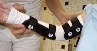 Frak­tu­ren trau­ma­ti­schen Ursprungs wer­den häu­fig beim Sport erlit­ten. Hier steht im Leis­tungs­sport die Ver­sor­gung mit einer indi­vi­du­ell nach Gips­ab­druck gefer­tig­ten Kunst­stoff- oder Car­bon-Orthe­se zur tem­po­rä­ren Sta­bi­li­sie­rung 1 und Ruhig­stel­lung im Vor­der­grund. Soll­ten Frak­tu­ren im Bereich der Hand auf­tre­ten, gilt es auch wei­ter­hin die benach­bar­ten Gelen­ke ruhig­zu­stel­len, um im Zeit­raum von 5 bis 6 Wochen ein gutes Behand­lungs­er­geb­nis erzie­len zu kön­nen (Abb. 2).