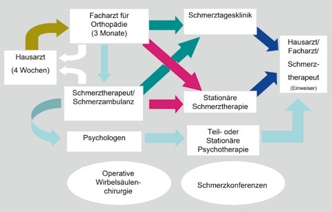 In der hausärztlichen Praxis sind Rückenschmerzen der dritthäufigste und in der orthopädischen Praxis sogar der häufigste Konsultationsgrund (KV Nordrhein, 2006). Es existiert keine verbindliche oder konsentierte Schnittstellendefinition zur Überweisung zum Facharzt für Orthopädie oder zum Speziellen Schmerztherapeuten. Oft gelten Hinweise auf einen abwendbaren gefährlichen Verlauf („red flags”) oder zeitlich persistierende Beschwerden ohne Besserungstendenz als Überweisungsgrund. Teilweise werden Überweisungswünsche der Patienten selbst bei Unzufriedenheit mit der bisherigen Behandlung, zur Diagnoseüberprüfung und in der Hoffnung auf neue Diagnostik- und Therapiemöglichkeiten erfüllt 13. In dieser Untersuchung von Chenot zum Überweisungsverhalten und zur Kommunikation zwischen Hausärzten und Orthopäden waren mangelhafte Überweisungstexte und unklare Fragestellungen der Hausärzte und oft fehlende Befundberichte der Orthopäden ein Hinweis auf eine schlechte Strukturierung und eine Qualitätsminderung der Effektivität der ambulanten Patientenversorgung.