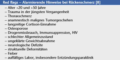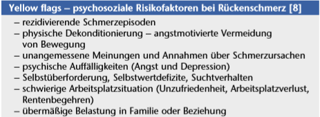Bei 5 bis 7 % der Patienten prolongiert die Schmerzsymptomatik über 12 Wochen mit Einmündung in eine Chronifizierung. Beim Chronifizierungsprozess spielen unbewusste Lern- und Konditionierungsvorgänge eine entscheidende Rolle. Die Schmerzfokussierung führt zu einer Einengung der Lebensperspektive, kann lebensbestimmend werden und zum Teil zu tiefgreifenden und dauerhaften Veränderungen des Lebensgefüges führen. Psychologische Risikofaktoren („yellow flags”) für die Chronifizierung von Schmerzen sind z. B. Depressivität und Hilflosigkeit als Reaktion auf die Schmerzen, auch die Angst vor Schmerzsteigerung durch Bewegung mit zunehmend eingeschränkter Mobilität und eine Dekonditionierung (Schmerzvermeidungsverhalten, „fear avoidance behavior”) (Tab. 2). Der Pfad zwischen Nichtstun und frühzeitiger notwendiger Interdisziplinarität bei erkennbarer Tendenz zur Chronifizierung bei vorliegenden Risikofaktoren ist im Einzelfall schmal 8. Die fehlende rechtzeitige Weichenstellung kann individuell ruinierende Krankheitsverläufe iatrogen mitverursachen.