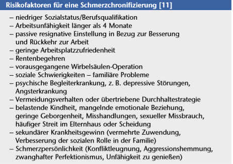 Soziale Chronifizierungsfaktoren sind z. B. der sekundäre Krankheitsgewinn, Arbeitsplatzkonflikte oder unbewältigter sozialer und familiärer Stress (Tab. 3). Man weiß, dass 50 % der Patienten, die länger als sechs Monate wegen Rückenschmerzen arbeitsunfähig geschrieben sind, nicht wieder in den Arbeitsprozess zurückkehren. Bestehen die chronischen Schmerzen länger als zwei Jahre, beträgt die Wahrscheinlichkeit der Rückkehr nahezu null 9. Nicht zu vernachlässigen ist der iatrogene Beitrag zur Chronifizierung z. B. durch Wartezeiten zum Behandlungszugang, Verordnung von passiven monomodalen Therapien, von passiven Orthesen und die Durchführung von nicht indizierten Operationen.