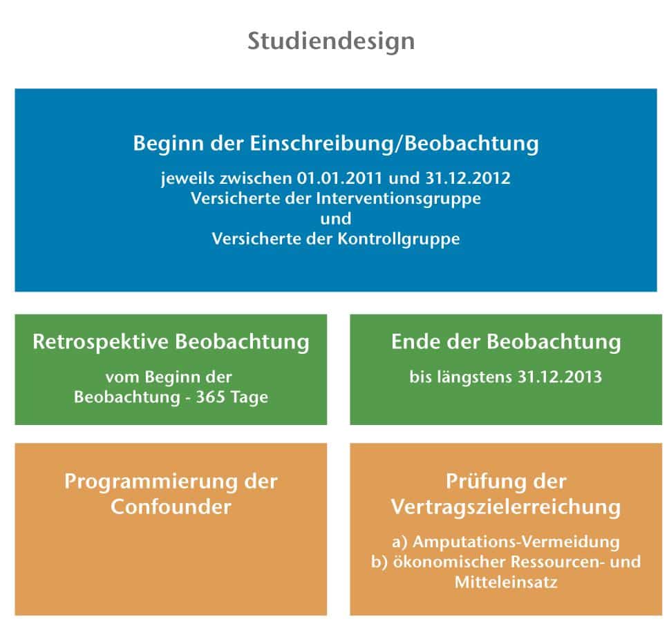 In einem vor­ab für jeden Ver­si­cher­ten defi­nier­ten Beob­ach­tungs­zeit­raum (1 bis 3 Jah­re) wur­de ermit­telt, ob die Ver­si­cher­ten Ampu­ta­tio­nen erle­ben und wel­che Ampu­ta­ti­ons­kos­ten, Ampu­ta­ti­ons­fol­ge­kos­ten und sons­ti­ge DFS- und/oder dia­be­tes­as­so­zi­ier­ten Leis­tungs­aus­ga­ben gene­riert wer­den. Die ampu­ta­ti­ons­ge­fähr­de­ten Ver­si­cher­ten der AP wer­den in die­ser Beob­ach­tungs­stu­die ab der erst­ma­li­gen Doku­men­ta­ti­on eines Wag­ner-Gra­des grö­ßer 0 bezüg­lich Ampu­ta­ti­ons­er­eig­nis­sen und Leis­tungs­in­an­spruch­nah­men beob­ach­tet. Bei den nicht ampu­ta­ti­ons­ge­fähr­de­ten Ver­si­cher­ten der PP wer­den nur die Leis­tungs­in­an­spruch­nah­men im Beob­ach­tungs­zeit­raum ermit­telt. Wegen der feh­len­den Ran­do­mi­sie­rung wird ver­sucht, den Ein­fluss der bekann­ten und mess­ba­ren Stör­fak­to­ren mit geeig­ne­ten Ver­fah­ren (Adjus­tie­run­gen) zu kon­trol­lie­ren. Aller­dings sind, wie bei allen Beob­ach­tungs­stu­di­en, wei­te­re sys­te­ma­ti­sche Ver­zer­run­gen durch nicht mess­ba­re und/oder unbe­kann­te Stör­fak­to­ren möglich.