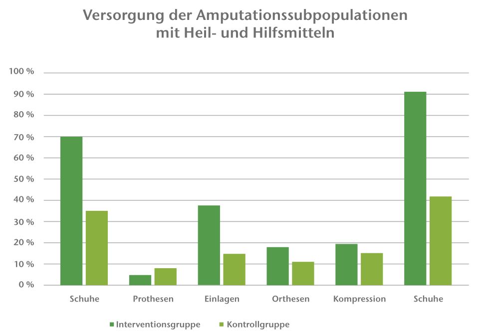 Als wei­te­re dia­be­tes­as­so­zi­ier­te Leis­tun­gen wer­den in die­ser Eva­lua­ti­on Anti­dia­be­ti­ka (Insu­li­ne und ora­le Anti­dia­be­ti­ka), Ver­band­stof­fe, podo­lo­gi­sche Behand­lun­gen, ortho­pä­di­sche Schuh­ver­sor­gung und die Ver­sor­gung mit Pro­the­sen defi­niert. Abbil­dung 4 zeigt die pro­zen­tua­le Ver­tei­lung der Ver­sor­gung der Ver­si­cher­ten der ampu­ta­ti­ons­ge­fähr­de­ten Sub­po­pu­la­ti­on (AP) mit DFS-spe­zi­fi­schen Heil- und Hilfs­mit­teln. Erkenn­bar ist, dass deut­lich mehr Ver­si­cher­te der AP der IG im Beob­ach­tungs­zeit­raum mit sol­chen Heil- und Hilfs­mit­teln ver­sorgt sind als Ver­si­cher­te der AP der KG.