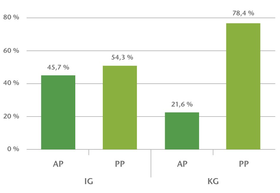 • Die Ampu­ta­ti­ons­quo­ten (Anzahl der Ampu­ta­tio­nen geteilt durch die Anzahl der ampu­ta­ti­ons­ge­fähr­de­ten Ver­si­cher­ten) sind in der AP der IG im Beob­ach­tungs­zeit­raum gerin­ger als in der AP der KG (22,55 vs. 26,60 %).