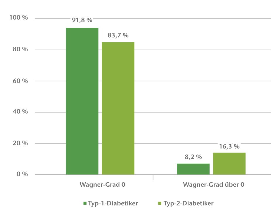 Die­se Auf­fäl­lig­kei­ten bei der Aus­wer­tung der DMP-Doku­men­ta­ti­on nahm die AOK Ber­lin, jetzt AOK Nord­ost, im Jahr 2010 zum Anlass, mit­tels einer tele­fo­ni­schen Stich­pro­ben­be­fra­gung bei den betrof­fe­nen Ver­si­cher­ten den Ergeb­nis­sen auf den Grund zu gehen. Hier­zu wur­den Ver­si­cher­te befragt, bei denen ein auf­fäl­li­ger Fuß­sta­tus doku­men­tiert wor­den war. Ein Teil der Ver­si­cher­ten war in haus­ärzt­li­cher, der ande­re in fach­ärzt­li­cher dia­be­to­lo­gi­scher Betreu­ung. Bei der Befra­gung fiel auf, dass beim Groß­teil der Ver­si­cher­ten in haus­ärzt­li­cher Ver­sor­gung kei­ne Über­wei­sung zur fach­ärzt­li­chen Mit­be­hand­lung vor­lag (83 % der beim Haus­arzt betreu­ten Ver­si­cher­ten). Posi­tiv konn­te dage­gen fest­ge­stellt wer­den, dass ca. 89 % der ange­ru­fe­nen Dia­be­ti­ker anga­ben, dass sie ihre Füße eigen­stän­dig oder mit Hil­fe von Ange­hö­ri­gen kon­trol­lie­ren und auf Auf­fäl­lig­kei­ten unter­su­chen. Aus den Anga­ben über Wag­ner-Gra­de (0 bis 5) und den Arm­strong-Klas­si­fi­ka­tio­nen (A bis D) ergab sich anhand der Daten der AOK Nord­ost für die Regi­on Ber­lin, dass es zwar abso­lut mehr Typ-2-Dia­be­ti­ker mit auf­fäl­li­gem Fuß­sta­tus gibt, der Anteil der Betrof­fe­nen unter den Typ-1-Dia­be­ti­kern aber pro­zen­tu­al höher liegt. Der Schwe­re­grad nach Wag­ner/Arm­strong-Aus­prä­gung war bei Typ-1-Dia­be­ti­kern wie­der­um nied­ri­ger als bei Typ-2-Dia­be­ti­kern. Ins­ge­samt waren 14,5 % der Typ-1-Dia­be­ti­ker und 9,5 % der Typ-2-Dia­be­ti­ker von einem DFS betrof­fen. Typ-2-Dia­be­ti­ker waren dop­pelt so häu­fig von einem DFS mit einem Wag­ner-Grad über 0 betrof­fen wie Typ-1-Dia­be­ti­ker (Abb. 1).