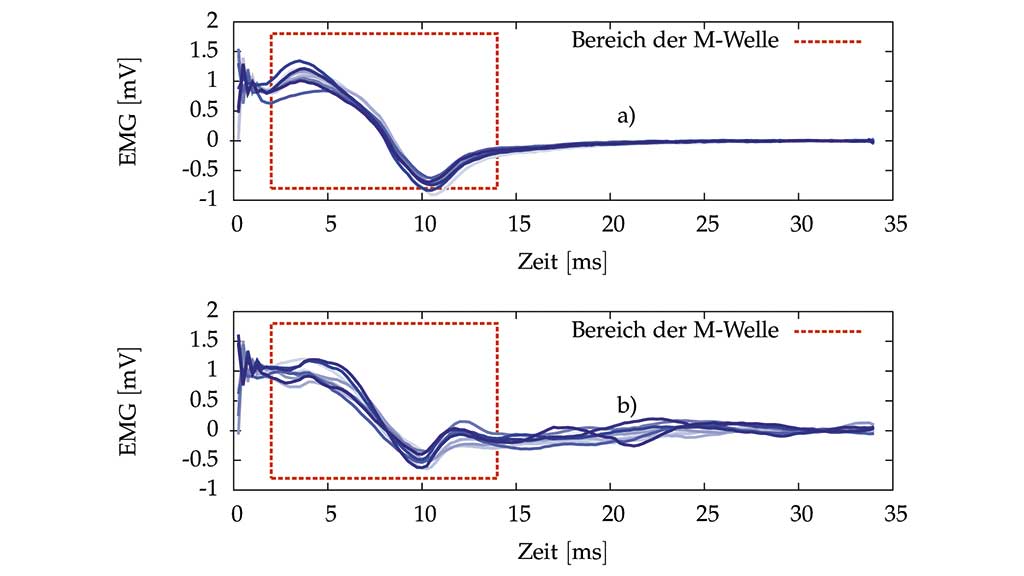 Ist das EMG-Signal zwi­schen den Sti­mu­la­ti­ons­im­pul­sen Arte­fakt-frei (kein Ent­la­dungs­vor­gang und kei­ne Ein­schwing­vor­gän­ge des Ver­stär­kers oder der Fil­ter), so kann die M‑Welle aus dem aktu­el­len EMG-Signal und den EMG-Auf­zeich­nun­gen der vor­he­ri­gen Sti­mu­la­ti­ons­pe­ri­oden geschätzt wer­den 23 24 25 26 27. Dies erfolgt unter der Annah­me, dass M‑Welle und Will­kür-EMG nicht mit­ein­an­der kor­re­liert sind. Fer­ner wird vor­aus­ge­setzt, dass sich die Form der M‑Welle über bis zu 15 Peri­oden nicht stark ändert. Ska­lie­run­gen der Ampli­tu­de der M‑Welle in Abhän­gig­keit von der Sti­mu­la­ti­ons­in­ten­si­tät sind jedoch zuläs­sig. Tat­säch­lich ist die Inva­ri­anz der M‑Wellenform für nahe­zu iso­me­tri­sche Mus­kel­kon­trak­tio­nen gut erfüllt 28.