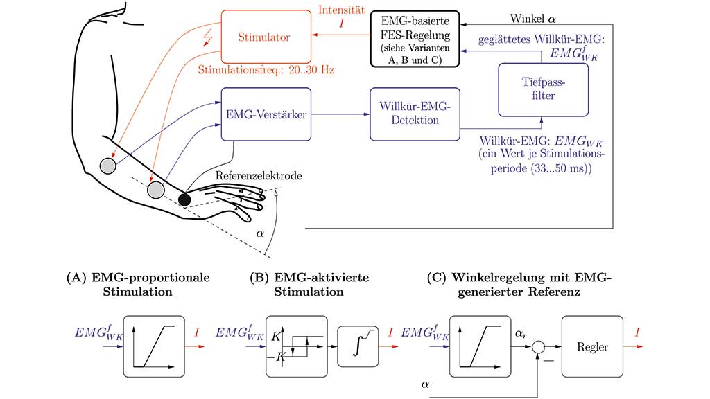 Eine Erwei­te­rung der EMG-gesteu­er­ten FES stellt die EMG-pro­por­tio­na­le Sti­mu­la­ti­on dar 29 30 31 32 33 34 35 36. Hier erfolgt eine kon­ti­nu­ier­li­che Detek­ti­on der Bewe­gungs­in­ten­tio­nen auch wäh­rend der Sti­mu­la­ti­on. Die schwa­chen wil­lent­li­chen Mus­kel­ak­ti­vi­tä­ten wer­den durch die Elek­tro­sti­mu­la­ti­on ver­stärkt, indem die Sti­mu­la­ti­ons­in­ten­si­tät pro­por­tio­nal zum geglät­te­ten Will­kür-EMG gewählt wird (Abb. 2, Vari­an­te A). Der durch die EMG-basier­te Sti­mu­la­ti­on geschlos­se­ne Regel­kreis mit dem Men­schen als Reg­ler weist bei eini­gen weni­gen Pati­en­ten Schwin­gun­gen auf. Ursa­chen dafür kön­nen unter ande­rem die Zeit­ver­zö­ge­rung durch die Fil­te­rung oder die Schwie­rig­keit des Pati­en­ten bei der Erzeu­gung einer gleich­mä­ßi­gen Mus­kel­kon­trak­ti­on sein.