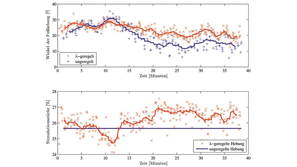 Um den Vor­teil eines λ‑geregelten Mus­kels gegen­über einer nor­ma­len unge­re­gel­ten Sti­mu­la­ti­on zu demons­trie­ren, wur­de bei­spiel­haft die Sti­mu­la­ti­on des Fuß­he­bers M. tibia­lis ante­rior betrach­tet. Die­se spielt bei der Kom­pen­sa­ti­on einer Fuß­he­be­schwä­che mit­tels Pero­ne­us­sti­mu­la­to­ren bei Schlag­an­fall­pa­ti­en­ten eine wesent­li­che Rol­le. Bei einer gesun­den Test­per­son, die mit frei hän­gen­dem Bein in einem Roll­stuhl saß, wur­de 40 Minu­ten lang abwech­selnd in einer simu­lier­te Schwung­pha­se der M. tibia­lis ante­rior direkt (unge­re­gelt) und λ‑geregelt sti­mu­liert. Die Inten­si­tä­ten (Ladung und λ‑Referenz) bei­der Vari­an­ten wur­den anfäng­lich so gewählt, dass eine Fuß­he­bung um 25° erzielt wur­de. Abbil­dung 3 zeigt das Ergeb­nis die­ses Tests. Bei den λ‑geregelten Sti­mu­la­ti­ons­in­ter­val­len kommt es im Lau­fe der Zeit zu einem deut­lich gerin­ge­ren Abfall der Fuß­he­bung. Die Rege­lung kom­pen­siert intern die auf­tre­ten­de Mus­kel­er­mü­dung durch eine Anpas­sung (Erhö­hung) der wirk­li­chen Sti­mu­la­ti­ons­in­ten­si­tät (Ladung), bis eine zuvor fest­ge­leg­te Sicher­heits­be­gren­zung der Ladung erreicht wird. Eine detail­lier­te­re Dar­stel­lung der Ergeb­nis­se ist Klau­er et al. 41 zu ent­neh­men. Die Über­trag­bar­keit die­ser Ergeb­nis­se auf Schlag­an­fall­pa­ti­en­ten wird der­zeit kli­nisch unter­sucht. Ers­te expe­ri­men­tel­le Ergeb­nis­se deu­ten auf einen gleich­falls posi­ti­ven Effekt der λ‑geregelten Sti­mu­la­ti­on hin.
