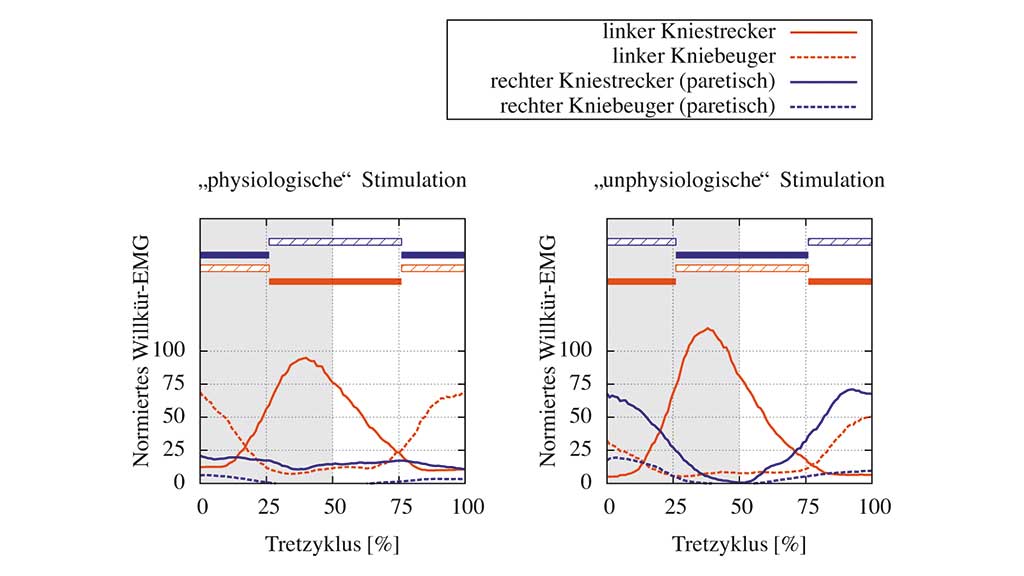 In Abbil­dung 4 sind die auf das gesun­de Bein nor­mier­ten Mus­kel­ak­ti­vi­tä­ten der Knie­stre­cker und ‑beu­ger einer Schlag­an­fall­pa­ti­en­tin beim iso­ki­ne­ti­schen FES-Fahr­rad­fah­ren dar­ge­stellt. Mit­hil­fe des Motors im Ergo­me­ter wur­de die Tritt­ge­schwin­dig­keit bei 40 U/min kon­stant gehal­ten. Der Pro­band wur­de auf­ge­for­dert, selbst­stän­dig mit bei­den Bei­nen mode­rat mit zu tre­ten. Die EMG-Mes­sun­gen wur­den bei einer mode­ra­ten, eher sen­so­risch wir­ken­den Sti­mu­la­ti­ons­in­ten­si­tät von 20 mA und 300 μs über die 9 x 7 cm gro­ßen Hydro­gel-Sti­mu­la­ti­ons­elek­tro­den durch­ge­führt (dass eine EMG-Mes­sung mit dem Sys­tem auch bei einer moto­risch effek­ti­ven Sti­mu­la­ti­on mit höhe­ren Sti­mu­la­ti­ons­am­pli­tu­den mög­lich ist, wur­de bereits in Shala­by et al. 44 gezeigt). In Abbil­dung 4 sind die ent­spre­chen­den Sti­mu­la­ti­ons­be­rei­che als Bal­ken dar­ge­stellt. Inter­es­sant ist, dass bei einer „phy­sio­lo­gisch sinn­vol­len“ Sti­mu­la­ti­on (Abb. 4, links, Akti­vie­rung der Stre­cker kurz vor und wäh­rend der Exten­si­ons­pha­se sowie Beu­ger kurz vor und wäh­rend der Fle­xi­ons­pha­se des Bei­nes) nahe­zu kei­ne Mus­kel­ak­ti­vi­tät im pare­ti­schen Bein beob­ach­tet wer­den konn­te. Hin­ge­gen konn­te bei einer „unphy­sio­lo­gi­schen“ Sti­mu­la­ti­on, bei der z. B. die Knie­stre­cker wäh­rend der Bein­beu­gung gereizt wer­den, eine pha­sen­ge­rech­te Akti­vie­rung des pare­ti­schen Bein­stre­ckers bei die­ser Pati­en­tin detek­tiert wer­den (Abb. 4, rechts).