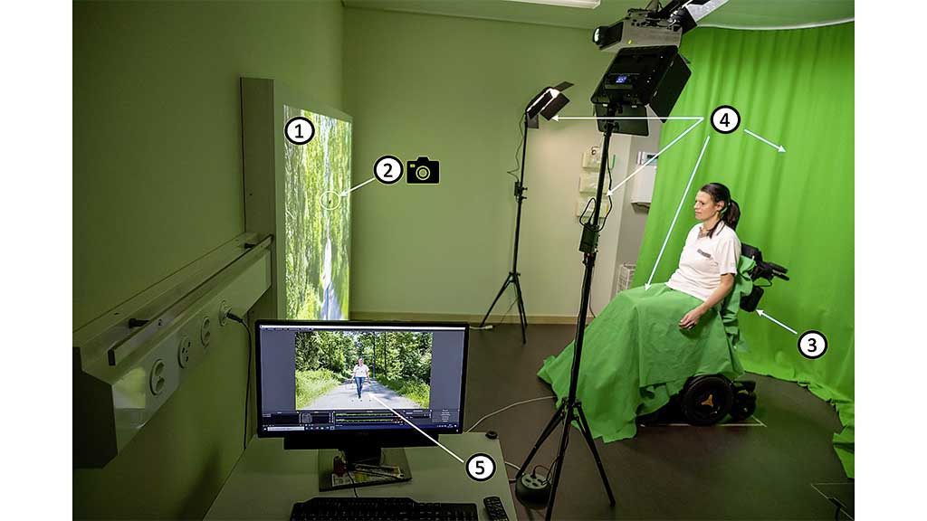 Unser VW-Setting verwendet eine grüne Leinwand, einen kippbaren Rollstuhl und eine natürliche Umgebung auf einer großen Leinwand. Ein solches Setting wurde unseres Wissens noch nicht verwendet. In einigen Studien wurde ein Spiegel mit einer Videoprojektion von gehenden Beinen verwendet17 18 19 20, in anderen bestanden die Gehstimuli aus einem Video einer Schauspielerin bzw. eines Schauspielers, die/der in der Ich-Perspektive einen Weg entlangging21 22, und in der letzten Studie betrachteten die Teilnehmenden ihre virtuellen Arme und Beine in der Ich-Perspektive in einer virtuellen Welt durch eine Virtual-Reality-Brille23.