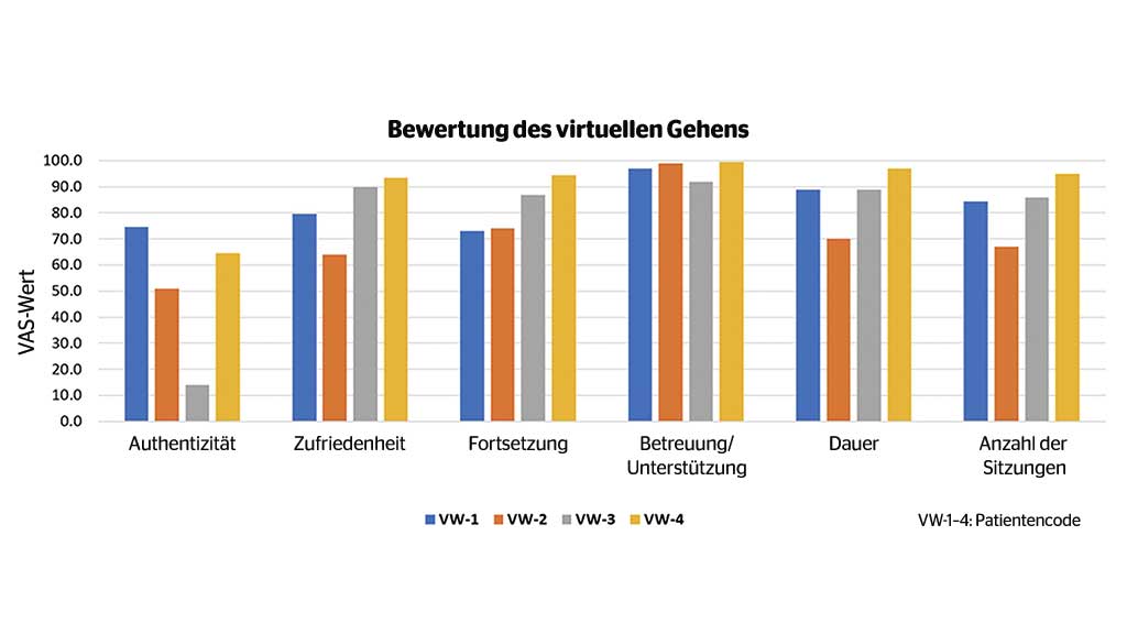 Chronische Schmerzen treten bei Patient:innen nach einer Rückenmarkverletzung (SCI) sehr häufig auf1. Die „International Spinal Cord Injury Pain Classification“ unterscheidet nozizeptive, neuropathische, andere und unbekannte Schmerzen2. Die Punktprävalenz chronischer neuropathischer Rückenmarkschmerzen bei Rückenmarkverletzungen beträgt 56 %3 und eine aktuelle Studie der Schweizer Bevölkerung mit Rückenmarkverletzungen ergab, dass 73 % unter chronischen Schmerzen leiden4. Trotz der hohen Prävalenz von SCIP (Spinal Cord Injury Pain) stellt die Behandlung nach wie vor eine Herausforderung dar. Jüngste Übersichtsarbeiten kommen zu dem Schluss, dass es an Belegen für die Wirkung pharmakologischer und nicht pharmakologischer Behandlungen mangelt5. Außerdem ist die medikamentöse Behandlung mit zahlreichen Nebenwirkungen verbunden6. Dies könnte darauf zurückzuführen sein, dass die Biologie, die der SCIP zugrunde liegt, sowie die Mechanismen, die zur Chronifizierung von Schmerzen führen, nicht vollständig verstanden sind. Ein Modell, das möglicherweise relevant ist, ist das kortikale Modell des pathologischen Schmerzes7. Dieses Modell geht davon aus, dass den Schmerzen eine gestörte kortikale propriozeptive Reaktion zugrunde liegt, die durch ein Missverhältnis zwischen motorischem Output und sensorischem Feedback entsteht. Daher wurde eine innovative Therapie namens virtuelles Gehen (VW) weiterentwickelt, die auf der Arbeit von Moseley8 und den Grundsätzen der Spiegeltherapie basiert.