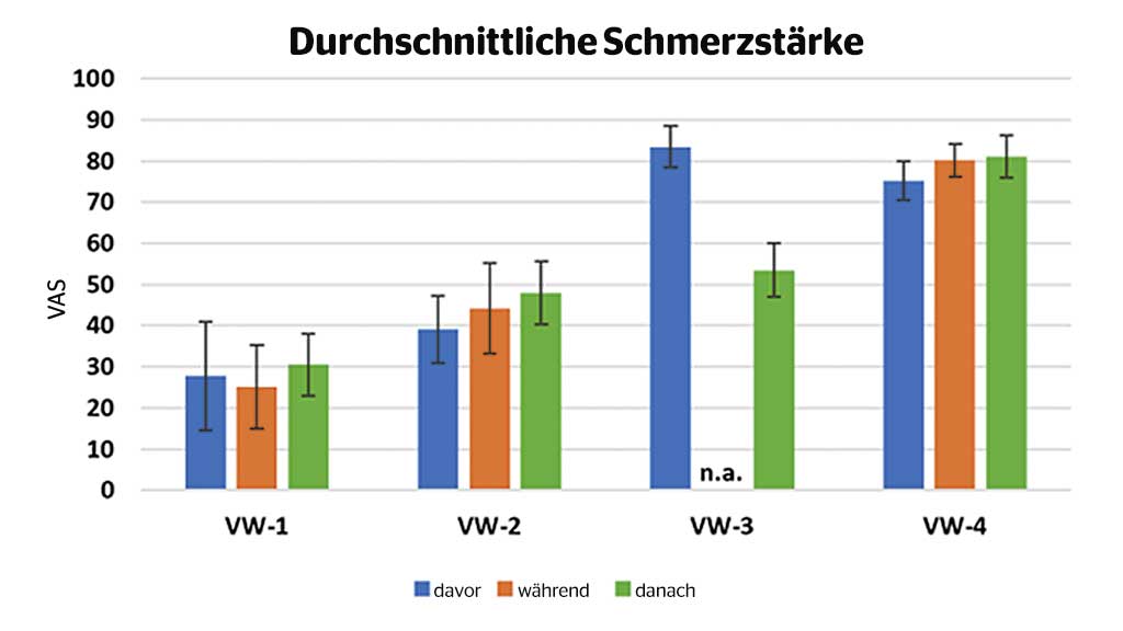 VW‑3 und VW‑4 wiesen vor der Therapie den höchsten Grad der chronischen Schmerzschwere auf dem GCPS auf, VW‑1 und VW‑2 den niedrigsten. Nach der Therapie wurden bei VW‑1 und VW‑4 keine Veränderungen gemessen. VW‑2 zeigte einen Anstieg auf Grad 3 und VW‑3 einen Rückgang auf Grad 3.
