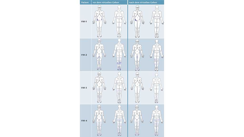 Schmerztagebuch und Schmerzzeichnung: Die Schmerzintensität als sekundäres Ergebnis war unterschiedlich. Ein Patient hatte eine Schmerzreduktion um VAS 31 mm, die anderen drei eine leichte, klinisch nicht relevante Zunahme um VAS 1–7 mm (Abb. 3). Ein Patient zeigte eine geringe Schmerzverbesserung unter VW, bei einem Patienten fehlten Werte während der Therapie. Ein Patient berichtete über besseren Schlaf nach der Therapie. Veränderungen in der Schmerzverteilung waren bei allen Patient:innen zu beobachten. Veranschaulicht wird dies durch die Schmerzzeichnungen (Abb. 4). VW‑1 zeigte nur marginale bis keine Veränderung der Schmerzen, VW‑2 zeigte eine Verringerung der Schmerzen am Oberschenkel ventral, dem Unterschenkel dorsal sowie an den Fußsohlen. VW‑3 zeigte die größte Verringerung der Schmerzverteilung durch vollständiges Aufhören der Schmerzen im Bein ventral sowie im Fußrücken und eine starke Verringerung der Schmerzen im Oberschenkel dorsal und in den Unterschenkeln. Bei VW‑4 war die Schmerzverteilung vor und nach der VW-Therapie fast gleich.