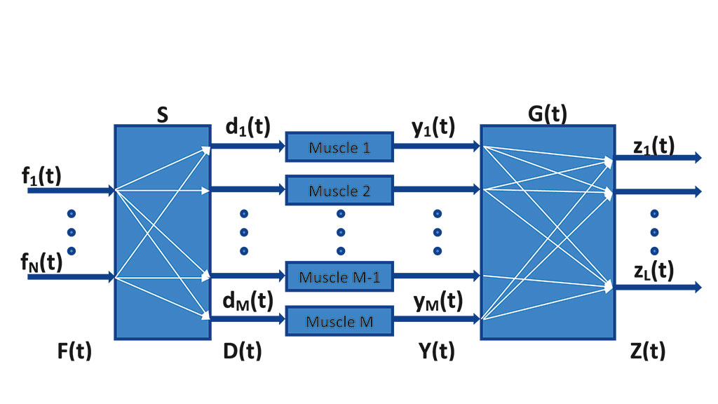 Um die­se kom­ple­xen phy­sio­lo­gi­schen Zusam­men­hän­ge bes­ser zu ver­an­schau­li­chen, bedient man sich am bes­ten eines Modells. Abbil­dung 1 zeigt so ein gene­ri­sches, phy­sio­lo­gi­sches Modell 9, das im Prin­zip aus drei Funk­ti­ons­grup­pen besteht: I) eine recht­ecki­ge Syn­er­gie-Matrix S, II) den Mus­keln des Unter­arms (als par­al­lel lie­gen­de Recht­ecke gezeich­net) und III) einer Mix-Matrix G. Man muss sich vor­stel­len, dass an einer Stel­le im Gehirn, genau­er gesagt dem Prä­fron­ta­len Kor­tex (= Zen­tren Will­kür­li­cher Ent­schei­dungs­fin­dung), eine Bewe­gungs­ent­schei­dung getrof­fen wird, die­se im Modell von links als Funk­ti­ons­kom­po­nen­te des Mus­kel­funk­ti­ons­vek­tors F(t) über die Syn­er­gie-Matrix S der­art an die gezeich­ne­ten Mus­keln gelei­tet wird, dass deren Rekru­tie­rung der Bewe­gungs­ent­schei­dung ent­spre­chend durch­ge­führt wird. Die Syn­er­gie-Matrix ist also für die Aus­wahl der Mus­keln zu einer „gedach­ten“ Bewe­gungs­ent­schei­dung ver­ant­wort­lich. Vom Motor­kor­tex aus wer­den nun die effe­ren­ten Steu­er­si­gna­le an die Motor­neu­ro­nen im Rücken­mark gelei­tet, im Modell mit D(t) bezeich­net; die Motor­neu­ro­nen inner­vie­ren Mus­kel­fa­sern, und die aus­ge­wähl­ten Mus­keln kon­tra­hie­ren. Die­ses Kon­tra­hie­ren erzeugt in den Mus­keln die „inne­ren“ EMG-Signa­le, im Modell als Y(t) bezeich­net, wel­che durch die Mix-Matrix G(t) an die Haut­ober­flä­che gelan­gen und schließ­lich als Z(t)-Signale von Elek­tro­den abge­lei­tet werden.