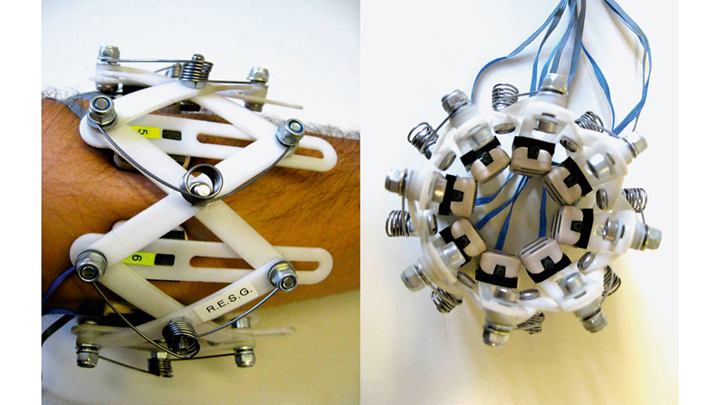 Wer­den also z. B. acht Elek­tro­den um einen Unter­arm her­um ange­ord­net, so erzeugt jede Mus­kel­kon­trak­ti­on einer (Phantom-)Bewegung ein cha­rak­te­ris­ti­sches Poten­zi­al­feld auf der Haut­ober­flä­che, das von den Elek­tro­den äqui­di­stant auf­ge­nom­men wird (sie­he Abb. 2). Abbil­dung 2 zeigt eine Trai­nings­an­ord­nung, die bereits sehr früh dem Anwen­der ange­legt wer­den kann, da kein expli­zi­ter Schaft benö­tigt wird. Spä­ter wer­den die Elek­tro­den im tat­säch­li­chen Schaft ange­bracht, was das Trai­nings­pa­ra­dig­ma selbst nicht ändert. Die acht Elek­tro­den lie­fern also ein bestimm­tes Mus­ter, das die Pro­the­sen­steue­rung inter­pre­tie­ren muss, um die ent­spre­chen­den Kom­po­nen­ten zu bewe­gen. Die rich­ti­ge Inter­pre­ta­ti­on muss die Pro­the­sen­steue­rung aber erst ler­nen, wozu ein Lern­pa­ra­dig­ma die benö­tig­ten Signa­le lie­fert. Man kann hier­bei prak­tisch belie­bi­ge Mus­ter erzeu­gen, um die­se zu ler­nen und sie dann Pro­the­sen­be­we­gun­gen zuzuordnen.