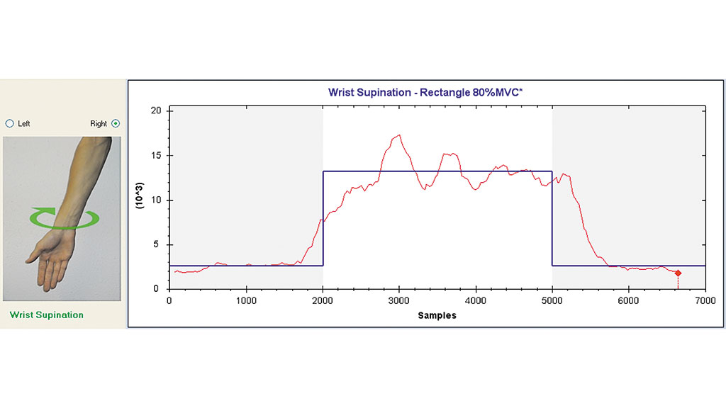 Zunächst wird eine Kali­brie­rung durch­ge­führt, bei der alle mög­li­chen Phan­tom­be­we­gun­gen mit für den Anwen­der maxi­mal ange­neh­mer Kon­trak­ti­ons­stär­ke durch­ge­führt wer­den. Dies ist dazu not­wen­dig, um die unter­schied­li­chen EMG-Stär­ken zu ver­ein­heit­li­chen. Abbil­dung 3 zeigt ein Bei­spiel für die Vor­ga­be für das Trai­ning der Hand­ge­lenks-Supi­na­ti­on mit 80 % der maxi­ma­len Kon­trak­ti­ons­stär­ke (MVC). Im lin­ken Teil der Abbil­dung wird die aktu­el­le Bewe­gung als Bild sei­ten­rich­tig ange­zeigt, wäh­rend der rech­te Teil einen Kon­trak­ti­ons-/Zeit­gra­phen zeigt, der in Blau die Pro­fil­vor­ga­be für 80 % MVC als Recht­eck­funk­ti­on anzeigt, dem über­la­gert ist in Rot die vom Anwen­der erzeug­te Kon­trak­ti­ons­stär­ke, wobei der rote Punkt mit der Zeit über den Gra­phen läuft. Die Abwei­chun­gen zwi­schen der blau­en Vor­ga­be und dem roten Kon­trak­ti­ons­ver­lauf des Anwen­ders erge­ben einen Score, der der Fer­tig­keit oder Eng­lisch „Abili­ty“ des Anwen­ders ent­spricht, das so prä­sen­tier­te „Item“ zu meistern.