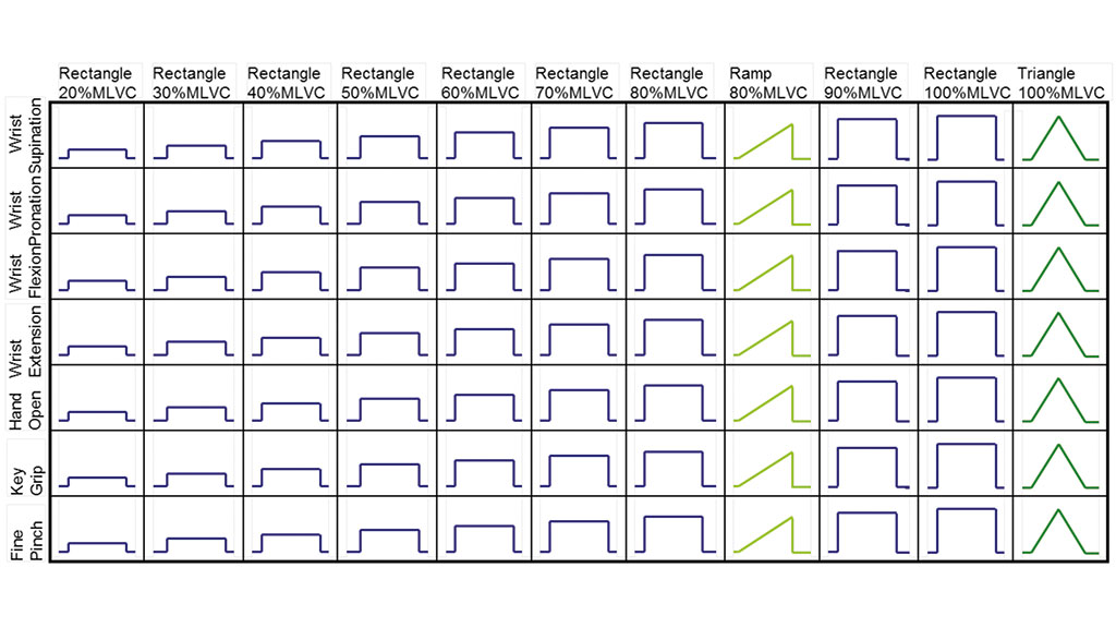 Ent­spre­chend der Abbil­dung 4 wird mit jedem der dar­in gezeig­ten Items so ver­fah­ren, was einer Daten­auf­nah­me für das Trai­ning des Klas­si­fi­ka­tors gleich­kommt, der die erzeug­ten und abge­lei­te­ten EMG-Signal­mus­ter letzt­lich Pro­the­sen­be­we­gun­gen zuord­net. Die Trai­nings­soft­ware führt also den Anwen­der durch das gesam­te Trai­nings­set; eine Sprach­aus­ga­be kün­digt auto­ma­tisch den Beginn einer neu­en Bewe­gungs-/Kon­trak­ti­ons­grup­pe akus­tisch an. Ein­stell­ba­re Pau­sen- und Kon­trak­ti­ons­zei­ten gestat­ten es, das Trai­ning an die jewei­li­gen Bedürf­nis­se des Anwen­ders abzustimmen.