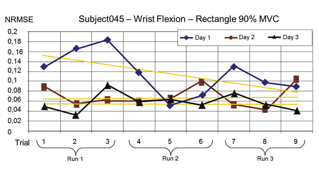 Abbil­dung 6 zeigt den exem­pla­ri­schen Ver­lauf (aus einer der­zeit lau­fen­den kli­ni­schen Stu­die) eines drei­tä­gi­gen Trai­nings für Hand­ge­lenks­fle­xi­ons­be­we­gun­gen – bei 90 % der Maxi­mal-Kon­trak­ti­on MVC. Die Abszis­se zeigt den zeit­li­chen Ver­lauf meh­re­rer Trai­nings­läu­fe (Run #); farb­lich kodiert sind die Trai­nings­ta­ge. Die Ordi­na­te zeigt den Feh­ler zwi­schen dem Vor­ga­be­pro­fil und der Leis­tung des Anwen­ders. Der Wert ist nor­miert auf den Bereich zwi­schen 0 und 1 und zeigt damit die mitt­le­re pro­zen­tua­le Abwei­chung, die der Anwen­der vom Vor­ga­be­pro­fil erreicht hat. Man kann deut­lich eine Abnah­me des Feh­lers, sowohl wäh­rend eines Tages (gel­be Regres­si­ons­ge­ra­de) als auch zwi­schen den Tagen erken­nen. Die Ergeb­nis­se der kom­plet­ten Stu­die wer­den nach deren Abschluss publi­ziert und dis­ku­tiert werden.